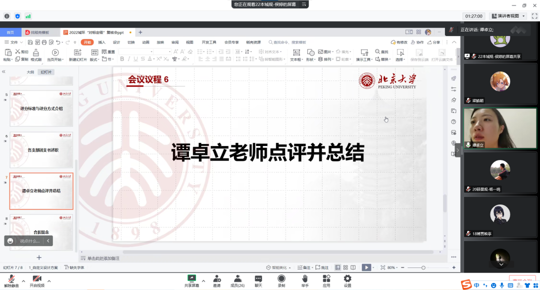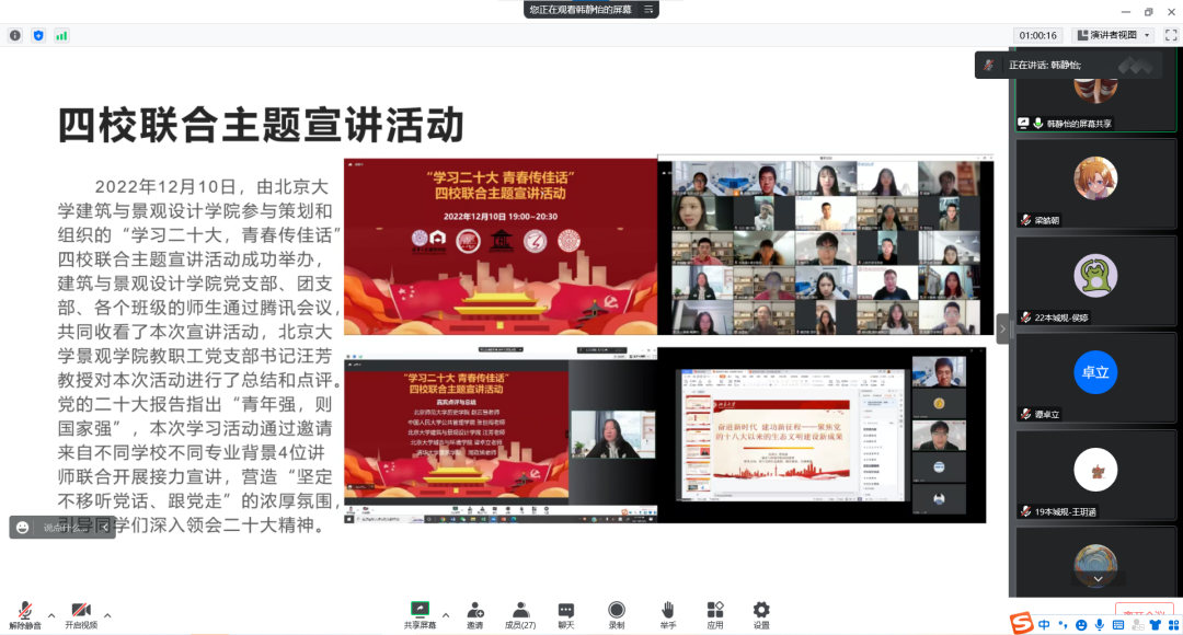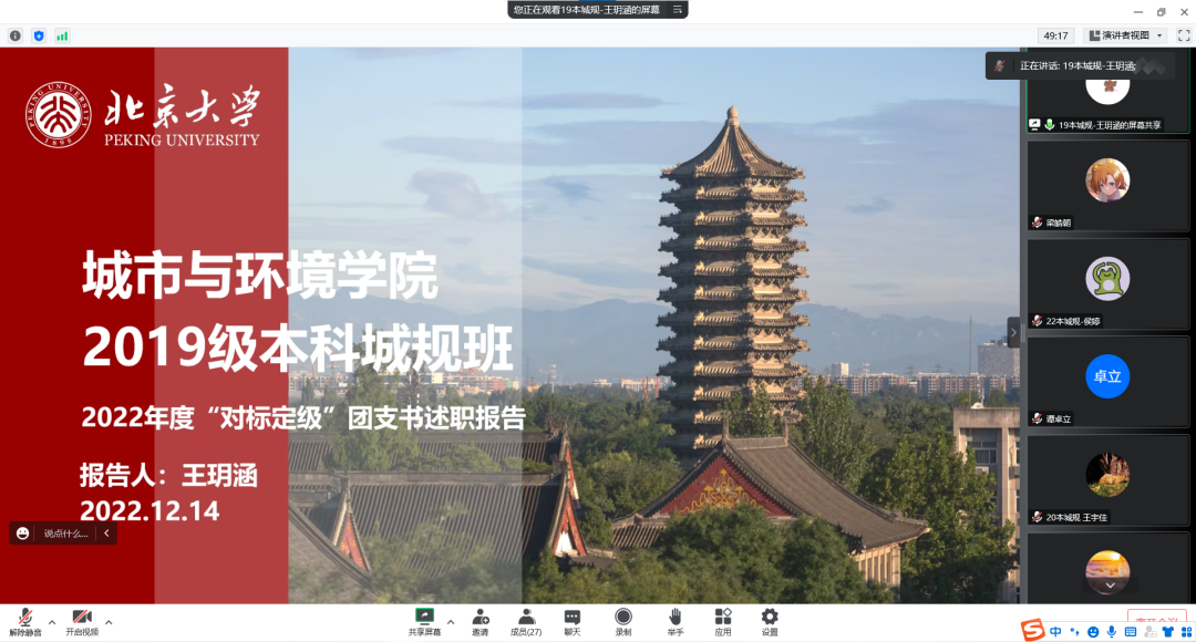 为了进一步提升基层团组织规范化建设的水平,不断增强基层团支部组织力和凝聚力, 12月14日晚,2022年韩国成人直播 基层团支部述职评议会于线上召开。学院党委副书记张新平,团委书记、学工办主任谭卓立,团委常务副书记宋宛儒出席会议,二十余名来自本、硕、博不同年级的团支部书记与会。会议由学院团委组织部侯婷主持。