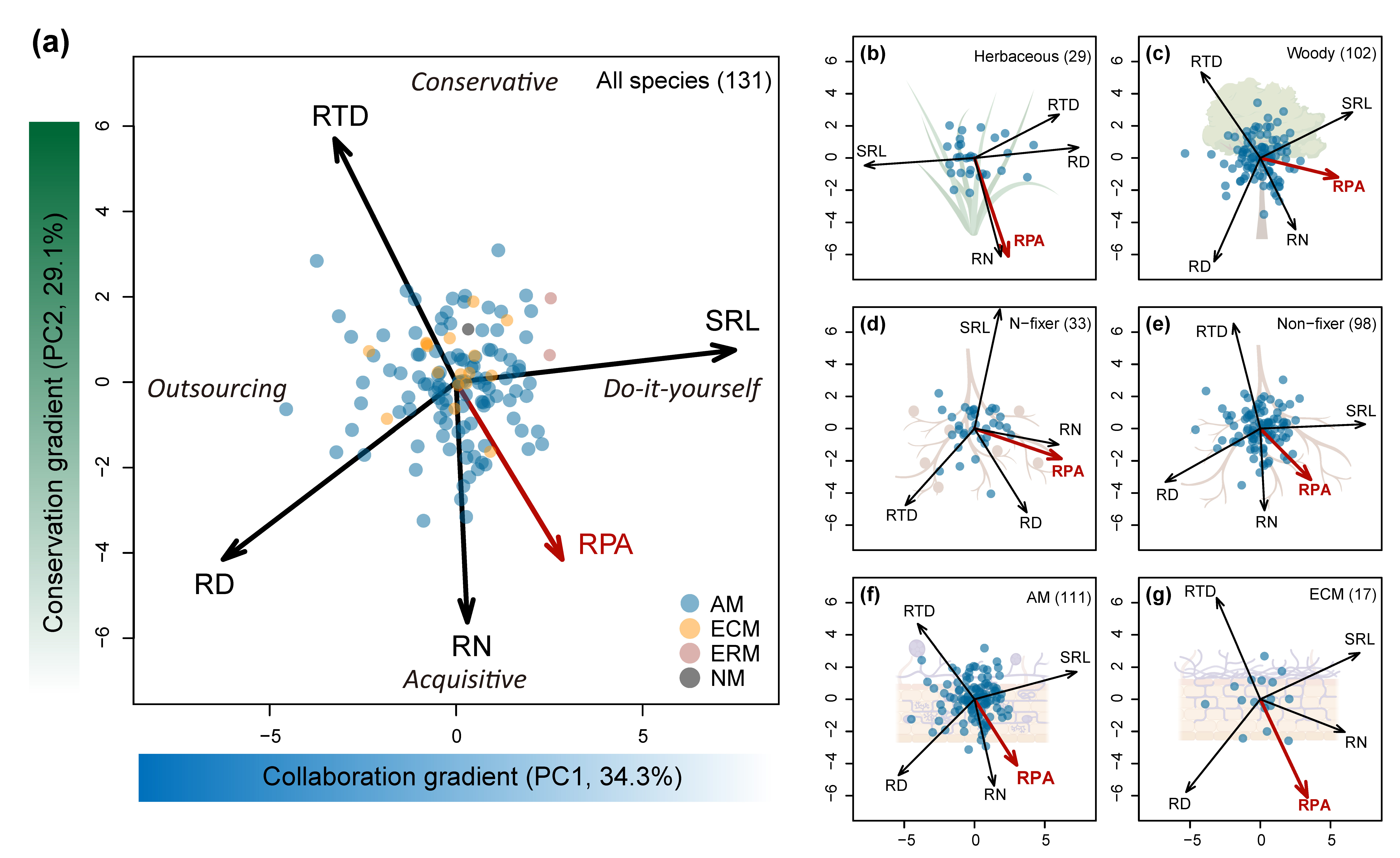 韩国成人直播 朱彪教授课题组系统构建了一个包含全球83项研究、涵盖514个物种的细根磷酸酶活性数据集以回答上述科学问题(图1)。首先,研究发现细根磷酸酶活性在生活型间(草本、木本)和菌根类型间(丛枝菌根、外生菌根)均没有显著差异。然而,固氮植物细根磷酸酶活性显著高于非固氮植物(图2)。其次,本研究结果验证了细根性状主要沿两个独立维度变化,即二维“细根经济空间(Root Economics Space, RES)”。一个是以组织密度和细根氮含量为代表的“保守”维度(Conservation gradient),主要刻画细根资源获取能力;另一个是以细根直径和比根长为代表的“合作”维度(Collaboration gradient),主要刻画资源获取方式。本研究表明,细根磷酸酶活性主要位于“保守”维度的“获取”端,这种模式在不同植物功能群之间普遍存在(图3)。进一步发现,细根磷酸酶活性与比根长、比根面积、细根氮含量和氮磷比正相关,与细根直径、组织密度和细根磷含量负相关,而与细根分支强度、菌根侵染率没有显著关系(图4)。